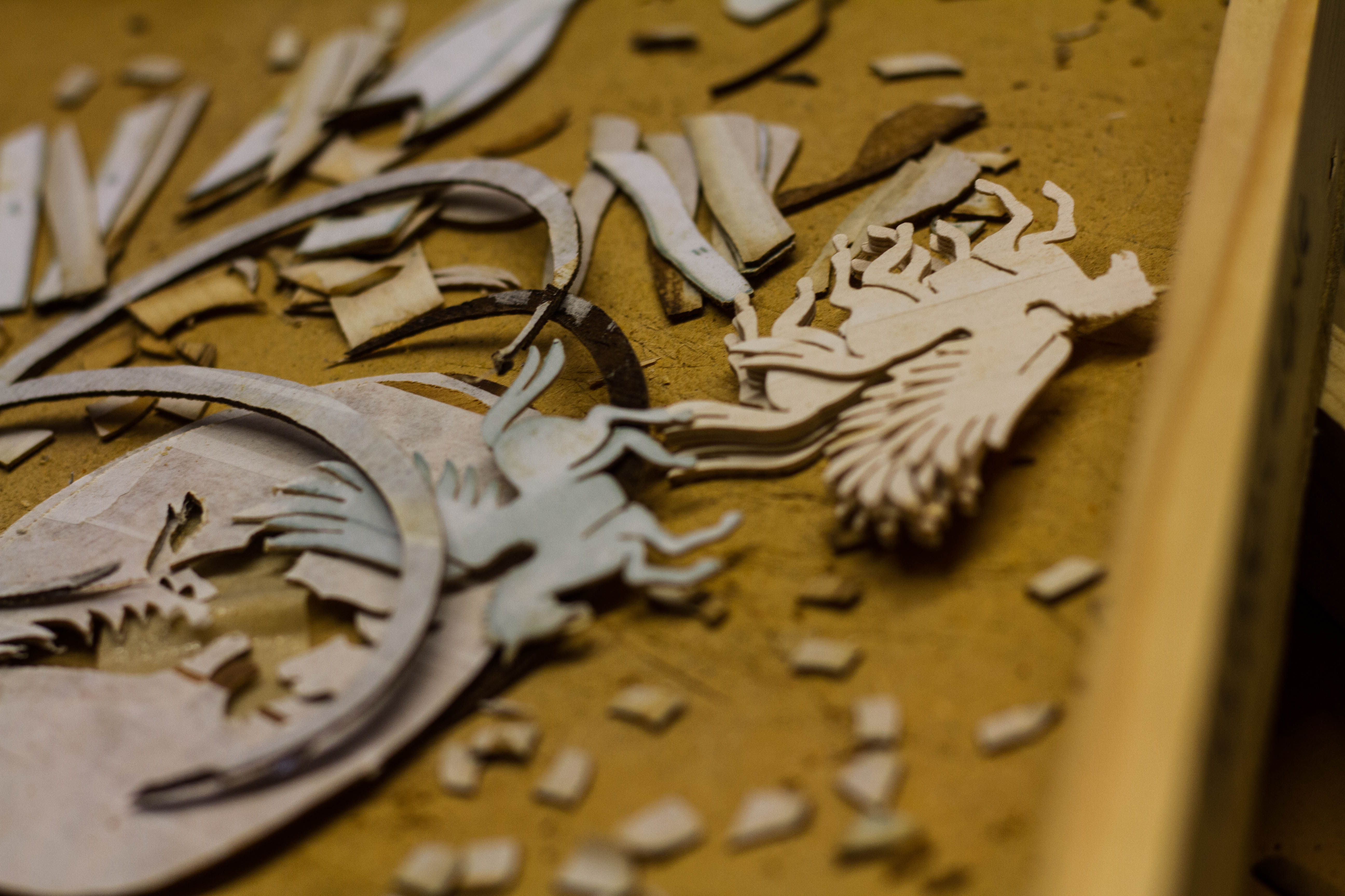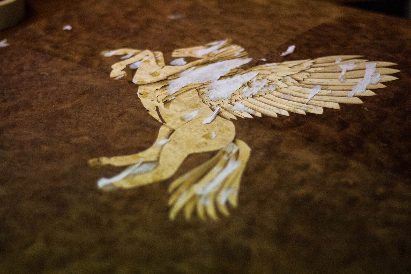 Our work includes finely detailed art such as flower petals. Its cut in differing shades or angles of grain to add dimensions to the overall finish. Each piece must fit with precision. These are burnt in hot sand to give the three-dimensional effect, fitted together like a large intricate jigsaw puzzle. This is then used to decorate bespoke furniture, pictures, luxury décor and wood panels of fine art.